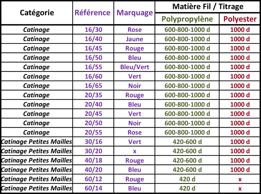 Les largeurs de nos filets sont identifiées par un fil de couleur.